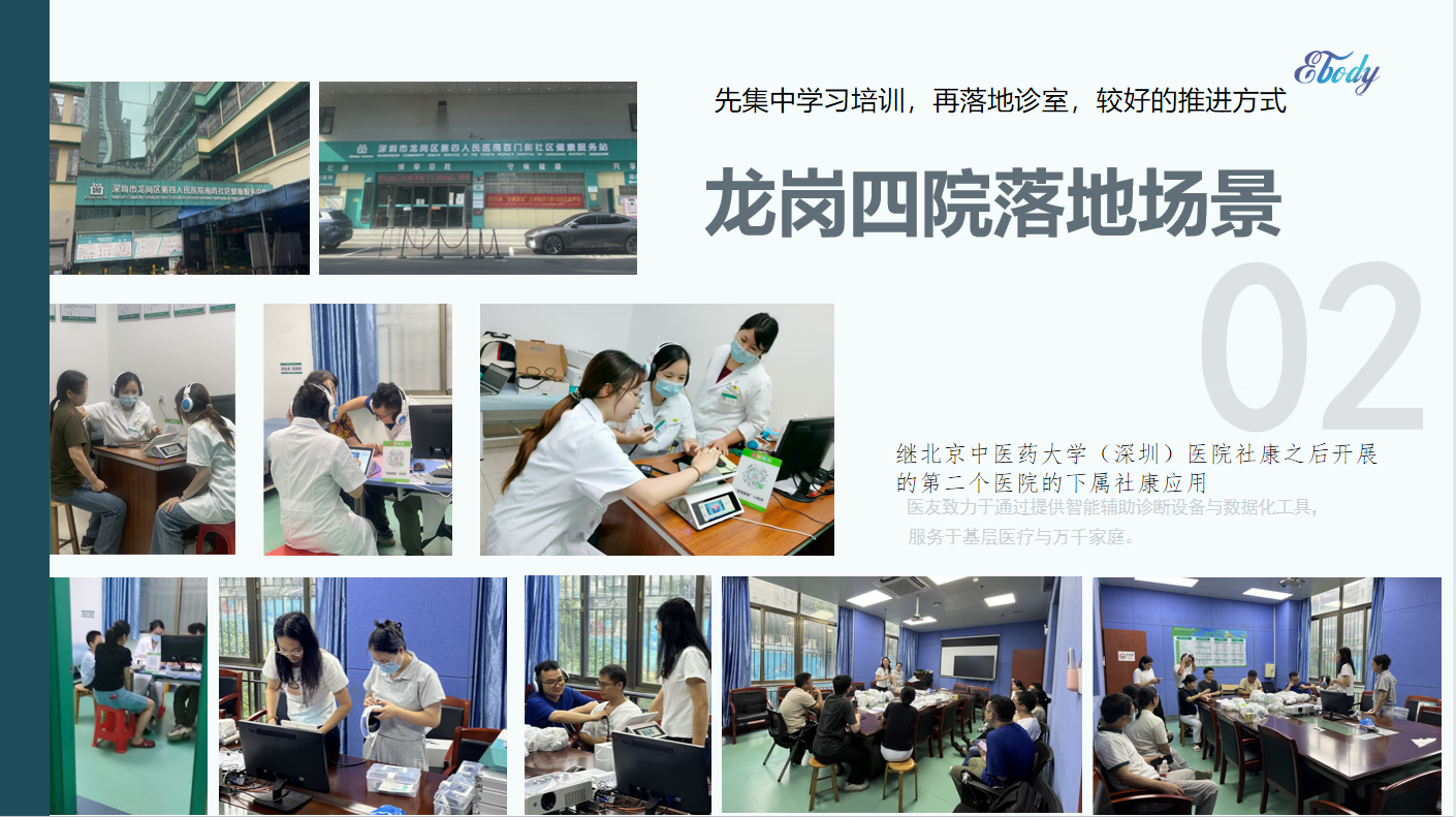 在龙岗区政府支持下,深圳市医友天下科技有限公司于2025年6月至8月期间,在北京中医药大学深圳医院社康中心(含颐安社康、保利上城社康等)及龙岗区第四人民医院社康中心(含南岭社康、百门前社康、上李朗社康、乐山社康等)开展了“E听诊”智能听诊系统试点。